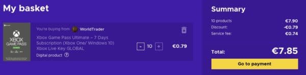 Bei Eneba bekommt ihr jetzt 70 Tage XBox Game Pass Ultimate für nur 7,66€ 7,85€. Dafür müsst ihr einfach 10x mal das Angebot von „SofKeyDog“ für je 0,82€ in den Warenkorb legen und den Code NPK nutzen: