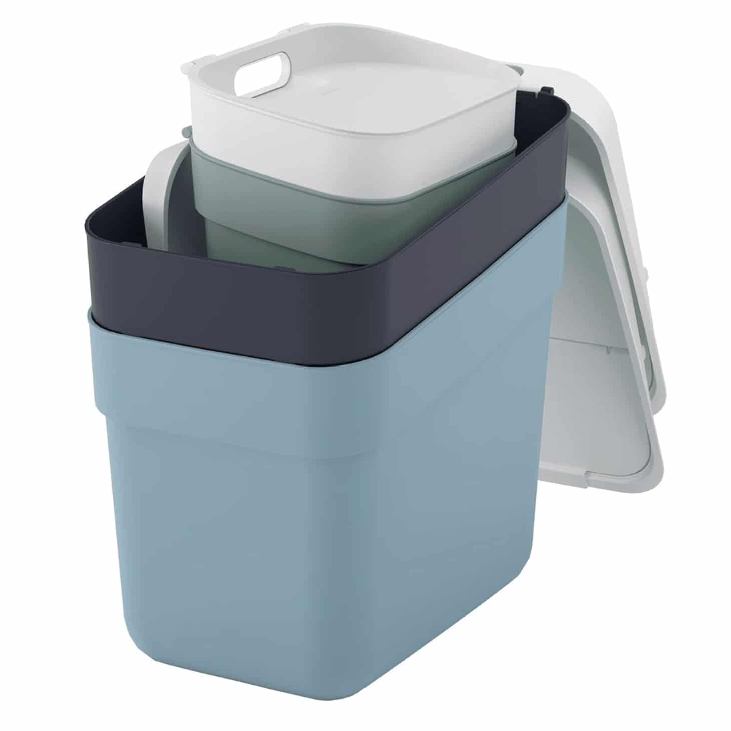 Dank des rechteckigen Designs passen die Eimer ideal in kleine Nischen oder direkt unter die Spüle. Die farbliche Markierung in Blau, Grün, Grau und Weiß hilft euch dabei, die Mülltrennung intuitiv und übersichtlich zu gestalten. Die glatten Oberflächen lassen sich zudem extrem leicht reinigen, falls mal etwas daneben geht.