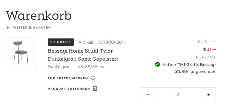 Besonders attraktiv wird es bei Sets. Das 2er-Set „Pinot“ kostet aktuell 58,99€. Legt ihr zwei identische Sets in den Warenkorb, wird eines automatisch abgezogen.