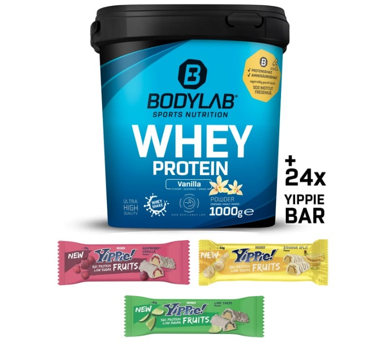 [Letzte Chance] 🏋♀💪 1kg Bodylab24 Whey Protein + 2x 12 Weider YIPPIE! Fruits Protein-Bars