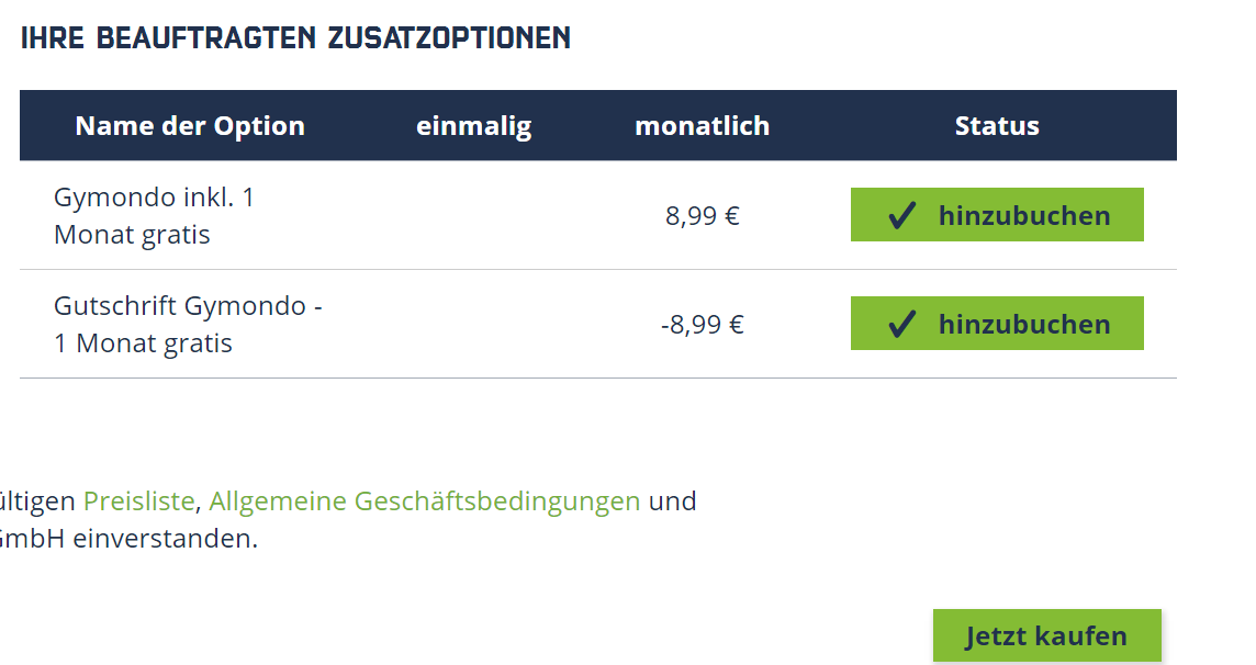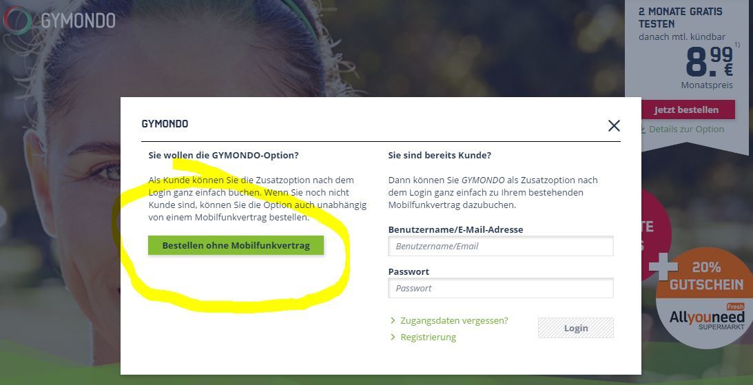 Das kommt nur, wenn du dich einloggst. Log dich bei Mobilcom mal komplett aus und lege Gymondo in den Warenkorb, ohne dich einzuloggen, sondern über den Button "Bestellen ohne Mobilfunkvertrag", siehe SCreenshot