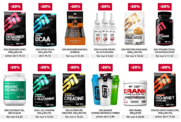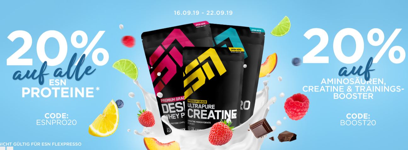 Ihr wollt mal wieder euren Vorrat an Eiweiß-Produkten & Co. aufstocken? Dann lohnt sich ein Blick zu Fitmart. Dort gibt es jetzt wieder satte 20% Rabatt auf ESN-Proteine mit dem Code „ESNPRO20“ und 20& auf Aminosäuren, Creatine & Trainingsbooster mit dem Code „BOOST20“.Neben dem extrem beliebten Whey sind auch dutzende weitere Artikel bestellbar – und der Rabatt gilt sogar on top zu Staffelungen! Hier mal Beispiel-Preise für euch: