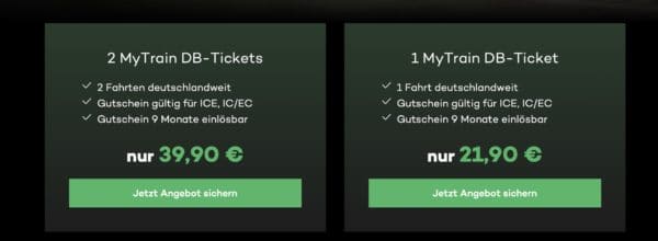 Wenn ihr in naher Zukunft gleich zweimal günstig Bahn fahren wollt, sichert euch mal das folgende Angebot: Für nur 69,90€ 39,90€ bekommt ihr 2 Bahntickets via MyTrain, also 19,95€ pro Ticket (oder alternativ auch ein einzelnes Ticket für 21,90€). Hier habt ihr noch mal die genauen Konditionen: