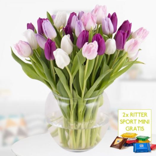 Blumen und Pralinen sagen ja angeblich mehr als 1000 Worte? 🙂 Dann verschickt doch mal als Überraschung einen Strauß farbenfroher Tulpen mit Schokolädchen! Der Blumenshop hat jetzt für 25€ inkl. Versand einen Strauß aus 40 Pastell-Tulpen und on top gibt es Rittersport Mini-Schokis dazu – ein Schnäppchen, das von Herzen kommt!