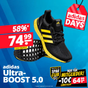 Habt ihr noch Platz im Schuhschrank? Denn dann solltet ihr diesen Platz mit den adidas UltraBOOST 5.0 DANN füllen. Diese sind gerade bereits für 74,99€ inkl. Versand bei SportSpar zu haben! In der Farbe Schwarz mit gelben Akzenten sind die UltraBOOST ein absoluter Hingucker!