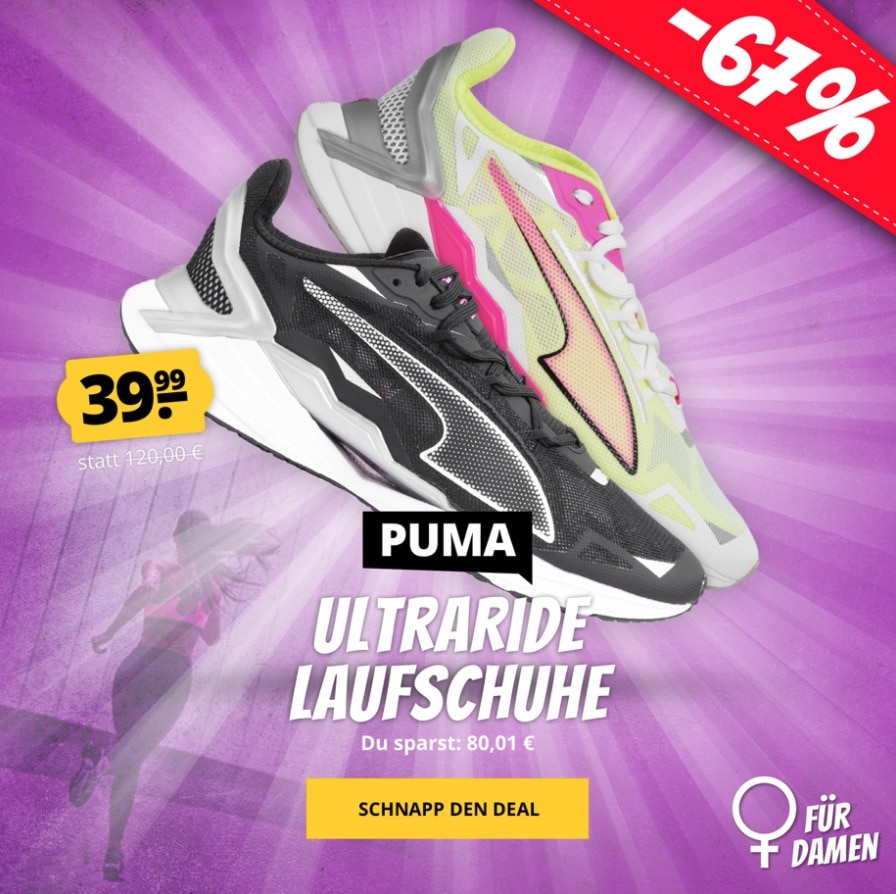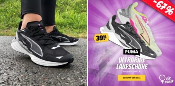 …animiert euch hoffentlich zum Lauf-Sport: Bei Sportspar gibt’s jetzt für die Mädels, Frauen, Damen die Puma UltraRide Damen Laufschuhe in 2 Farben für 40€. Ab 50€ Bestellwert hat man dann auch schon Gratis-Versand, andernfalls kämen noch 3,95€ Versandkosten dazu.