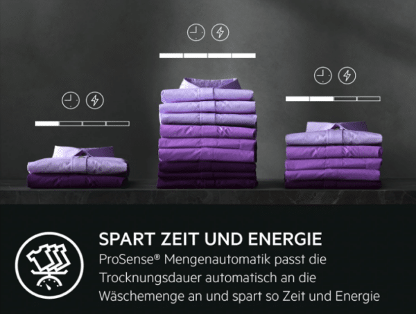 Mit der ProSense Mengenautomatik wird zudem sichergestellt, dass das Trocknen nicht nur sanfter, sondern auch effizienter abläuft. Dabei messen Sensoren die Beladungsmenge und passen Zeit sowie Energieverbrauch entsprechend an.