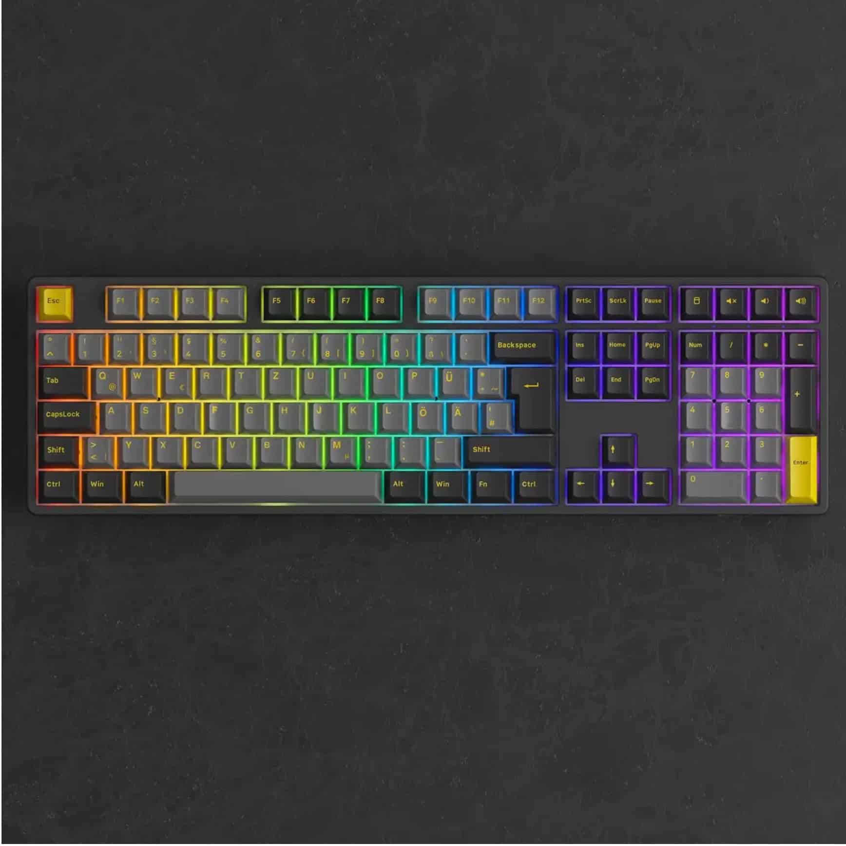 Kurz zur Wahl der Switches: Greift zu den gelben, linearen Switches, wenn ihr eine schnelle Auslösung beim Zocken bevorzugt. Wer viel schreibt und ein spürbares Feedback beim Tippen möchte, ist mit der blauen, taktilen Variante besser beraten. Die edle Farbkombination in Schwarz und Gold macht auf jeden Fall auf jedem Setup ordentlich was her und wirkt sehr hochwertig verarbeitet.