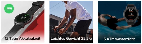 Wie bereits hat die Watch ein AMOLED-Touch-Display sowie GPS; außerdem 12 Sport-Modi, wie z.B. Laufen, Fahrradfahren, Schwimmen, sogar Skifahren usw. Unsere Freunde von China-Gadgets haben sich die Uhr schon angeschaut (s.o.) und ein kleines Fazit vergeben, das vor allem das Interesse von ambitionierten Gelegenheits-Sportlern wecken sollte: