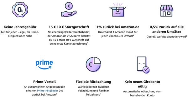 Neukunden erhalten je nach Prime-Status bis zu 40€ Startguthaben, das bei der ersten Abrechnung angerechnet wird. Außerdem gibt es 1% Cashback auf Käufe bei Amazon.de und 0,5% auf alle anderen Einkäufe, wo Visa akzeptiert wird. An speziellen Aktionstagen können Prime-Mitglieder sogar 2% zurückbekommen. Die Karte ermöglicht es euch, zwischen vollständiger Zahlung und einer flexiblen Teilzahlung zu wählen, was besonders nützlich sein kann, wenn größere Ausgaben anstehen.