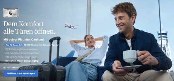 Aktuell erhaltet ihr folgendes Angebot: Die American Express Platinum Card mit 340 € Startguthaben oder 85.000 Membership Rewards® Punkten.