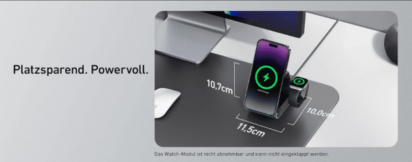 Zusätzlich bietet das Gerät einen Ladeplatz für eure Apple Watch und AirPods. Damit habt ihr eine zentrale Ladestation für eure wichtigsten Devices.