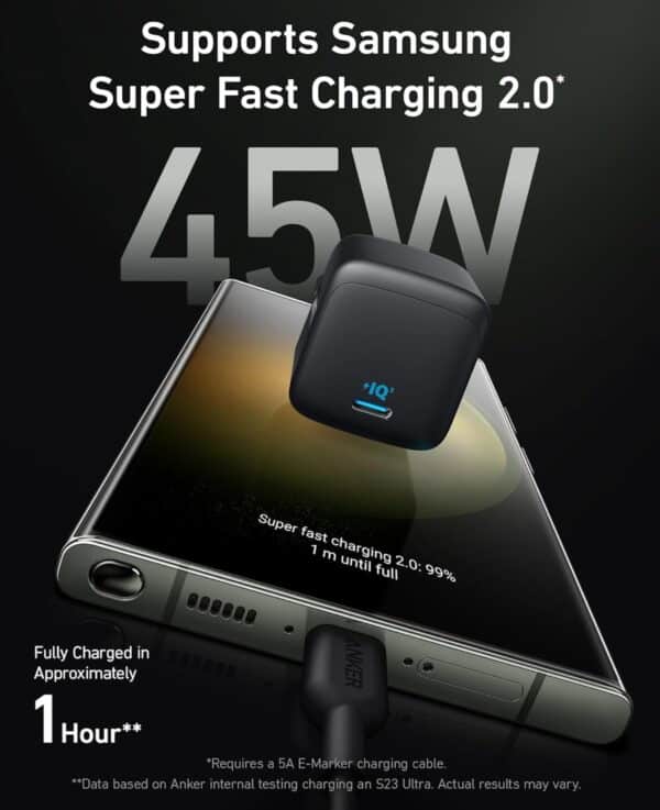 Falls ihr auf der Suche nach einem leistungsstarken Ladegerät seid, könnte dieses Modell interessant für euch sein. Es bietet 45W Ultraschnelles Laden 2.0, was gerade für Besitzer eines Samsung Galaxy S23 Ultra praktisch ist, da ihr euer Smartphone in weniger als einer Stunde komplett aufladen könnt. Behaltet allerdings im Hinterkopf, dass für diese schnelle Ladetechnologie ein 5A-Ladekabel nötig ist, welches nicht im Lieferumfang enthalten ist.