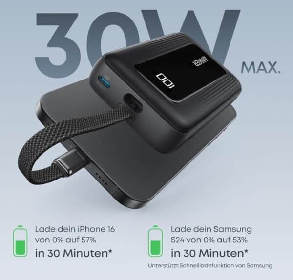 Die hier vorgestellte Anker Powerbank punktet mit einer Kapazität von 10.000mAh, was für die meisten mobilen Geräte mehr als ausreichend sein dürfte. Besonders praktisch ist die Möglichkeit, zwei Geräte gleichzeitig zu laden. Ein angeschlossenes Einzelgerät kann mit einer Leistung von bis zu 30 Watt geladen werden kann. Das bedeutet für euch, dass euer iPhone 16 in 30 Minuten auf 57% aufgeladen werden kann.