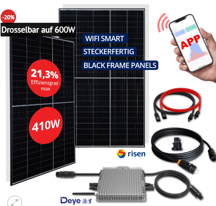 Beim DealClub bekommt ihr gerade ein günstiges Balkon-Solar-Set. Die Rede ist vom Balkonkraftwerk RIsen mit den Solarpanels, welche je bis zu 410W (820W) Leistung bringen + Wechselrichter und Adapter ab 559€ inkl. Lieferung. Verkauft wird es vom Foyex Shop.