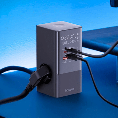 Baseus Steckdosenturm 🔌🔋 mit 2x USB-C, 2x USB-A, 3 Steckdosen & Verbrauchs-Anzeige