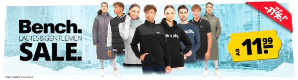 Im Onlineshop von SportSpar gibt es neben diversen anderen Sales auch noch einen Sale mit Kleidung und Sportgeräten der Marke Bench. Zusätzlich könnt ihr euch ab einem Bestellwert von 60€ noch den 5€ Rabatt aus dem Newsletter sichern.