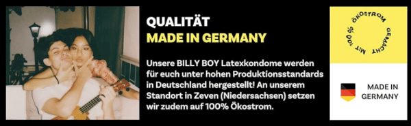 Der Gleitfilm und das Reservoir erhöhen nicht nur den Komfort, sondern sorgen auch für den notwendigen Schutz. Zudem sind alle BILLY BOY Produkte vegan, dermatologisch getestet und jedes einzelne Kondom wird elektronisch auf Fehler überprüft.