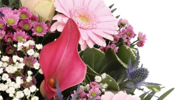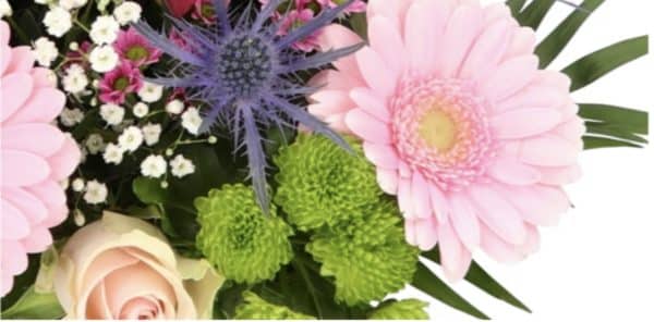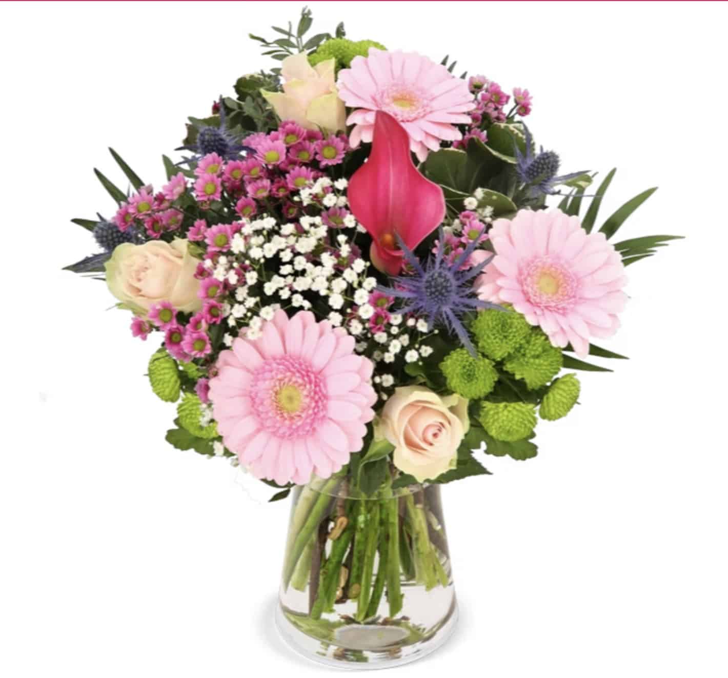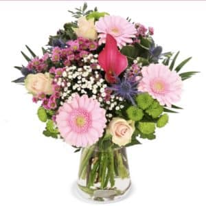 So besteht dieses Arrangement unter anderem aus pinken Rosen, rosafarbenen Gerbera, pinken und grünen Santini, Disteln, Pistacien, Schleierkraut und Pittusborum.