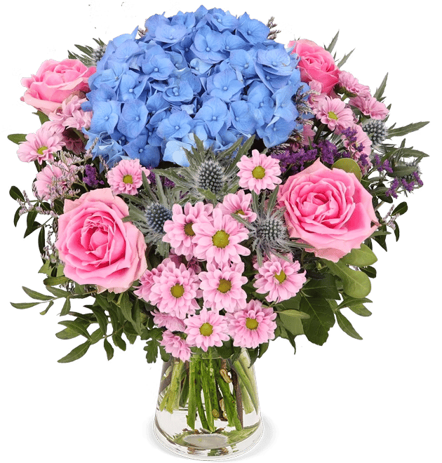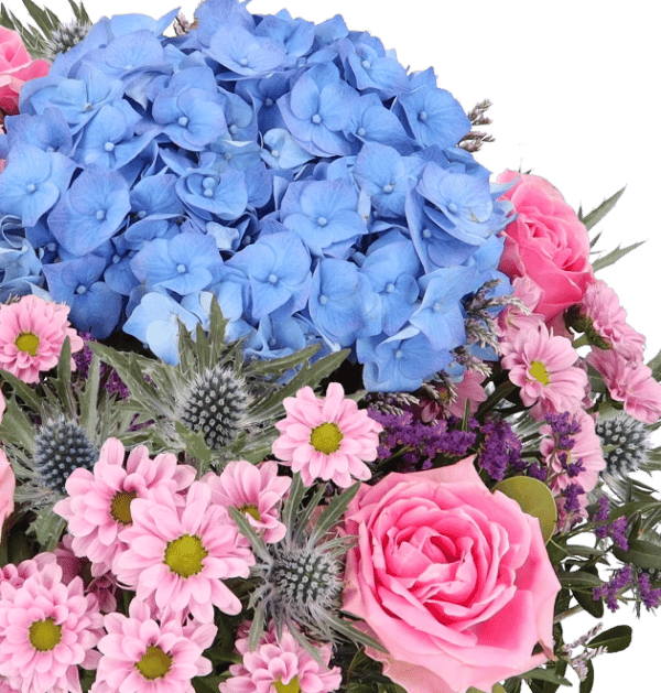 Mittig thront im Blumenstrauß die große Hortensie wie ein Mini-Strauß aus mehreren himmelblauen Blumen und sorgt mit der intensiven Farbe ihrer Blüten für eine stimmungsvolle und märchenhafte Atmosphäre. Umgeben ist sie dazu kontrastreich von herrlich pinken Rosen und den rosafarbenen Santini, die als ihre Verehrer dem wundervollen Strauß einen romantischen Touch geben.
