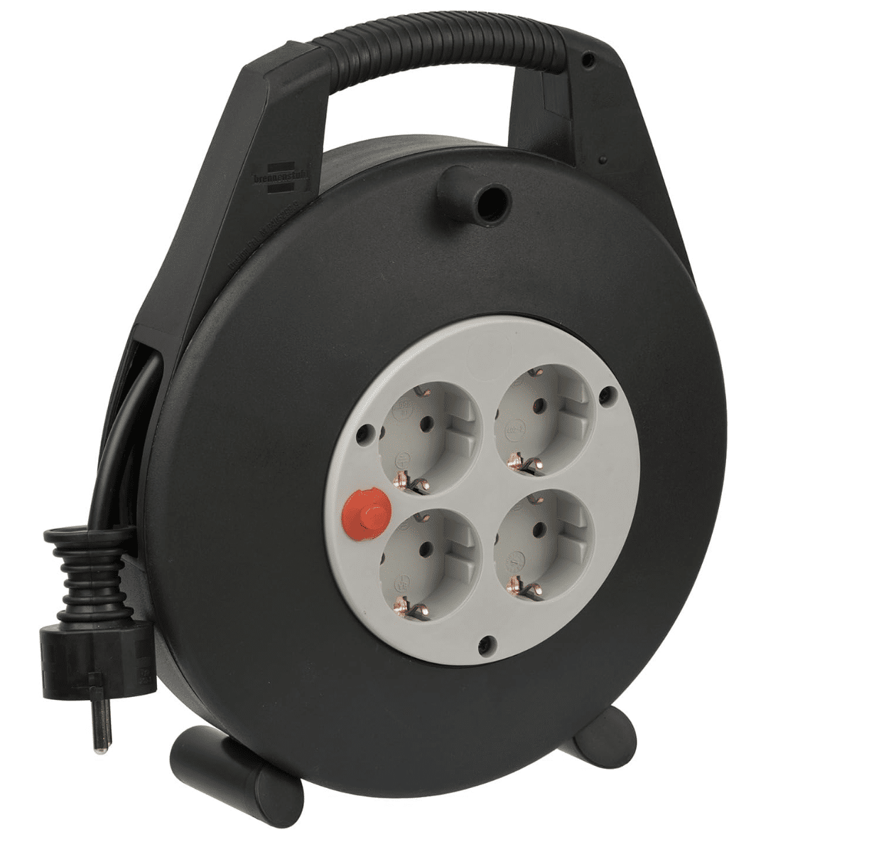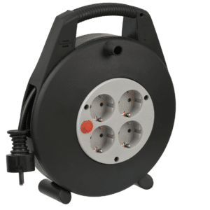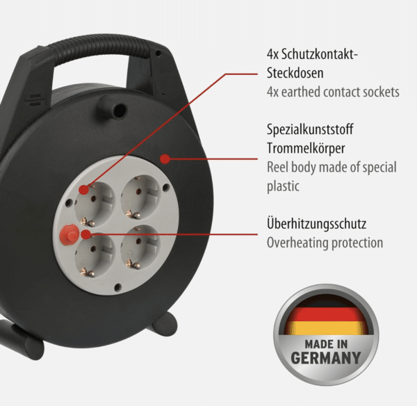 Die handliche Mini-Kabeltrommel kommt mit vier Schutzkontakt-Steckdosen und bietet somit genug Anschlussmöglichkeiten für eure Geräte. Ein Überhitzungsschutz und der erhöhte Berührungsschutz sorgen dabei für die nötige Sicherheit im Betrieb. Besonders praktisch ist der ergonomisch geformte Tragegriff, der einen einfachen Transport ermöglicht, sowie die stabile Standfestigkeit durch den Doppelfuß.