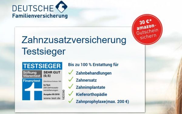 Wer noch auf die passende Zahnzusatz-Versicherung gewartet hat, kann aktuell relativ günstig zuschlagen und sich dabei noch einen 30€ Amazon Gutschein sichern. Die Deutsche Familienversicherung bietet diesen Bonus gerade bei ihren beiden ZahnSchutz Exklusiv und ZahnSchutz Premium Tarifen. Beim Stiftung Warentest Finanztest (11/2016) hat der Tarif mit der absoluten Bestnote abgeschnitten. Es ist also auch ein gutes Produkt, welches ihr hier zu guten Konditionen bekommen könnt: