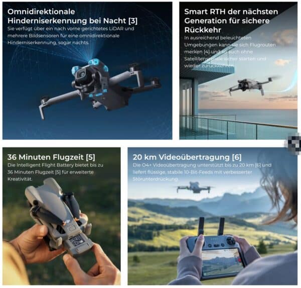 Wer auf der Suche nach einer leistungsstarken, aber gleichzeitig kompakten Drohne ist, könnte bei der DJI Mini 5 Pro fündig werden. Sie wiegt unter 250 Gramm und macht sie damit zu einem idealen Begleiter für Einsteiger, Content-Creator und sogar Profis. Der Clou liegt im großen 1-Zoll-CMOS-Sensor mit 50 MP, der für außergewöhnlich detailreiche Fotos und 4K/60fps HDR-Videos sorgt. Die Qualität der Aufnahmen wird zudem durch die hohe Lichtstärke der f/1,8-Blende unterstützt, die auch bei schwierigen Lichtverhältnissen für rauscharme Bilder sorgt.