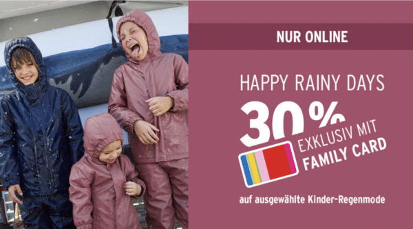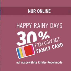Ernsting’s family hat eine besondere Aktion für unseren Kleinsten am Start! Dort gibt es nämlich 30% auf Regenmode für Kinder (nur online). Ihr braucht hierzu allerdings zunächst die Family Card. Die Versandkosten liegen bei 4,95€
