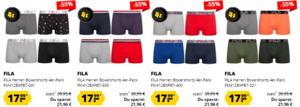 Wer noch ganz einfache, aber gute Boxershorts braucht, kann heute bei SportSpar günstig zuschlagen. Angeboten werden die Fila Herren Boxershorts im 4er Pack in 4 Farb-Kombis und 4 Größen für nur 17,99€ zzgl. 3,95€ Versandkosten (ab 50€ versandkostenfrei!).