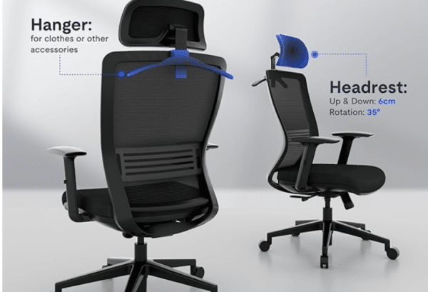 Die Rückenlehne ist speziell designt und beinhaltet integrierte Kleiderbügel, die nicht nur praktisch sind, sondern auch die Unterstützung des Rückens verbessern.