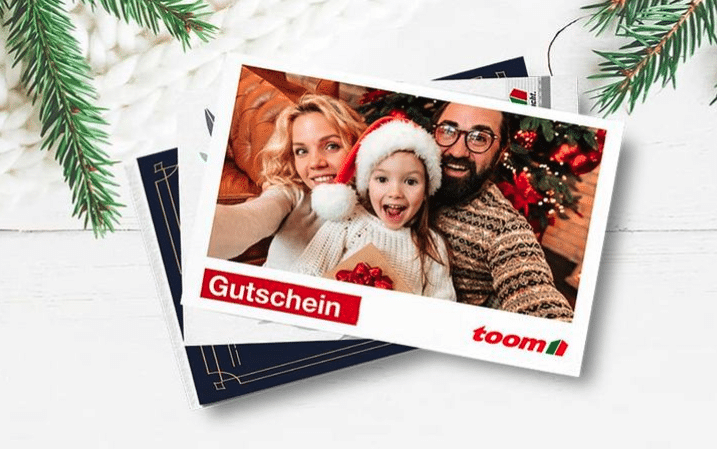 * Aktion gilt nur für den Kauf von haushaltsüblichen Mengen. Nur am 20.12.2024 in allen teilnehmenden Märkten (ausgenommen sind die toom Märkte Duisburg-Wanheimerort und Selb) und unter toom.de/gutscheine. Beim Onlinekauf wird der Gutschein wenige Tage später per E-Mail zugesandt (keine Online-Einlösung).
