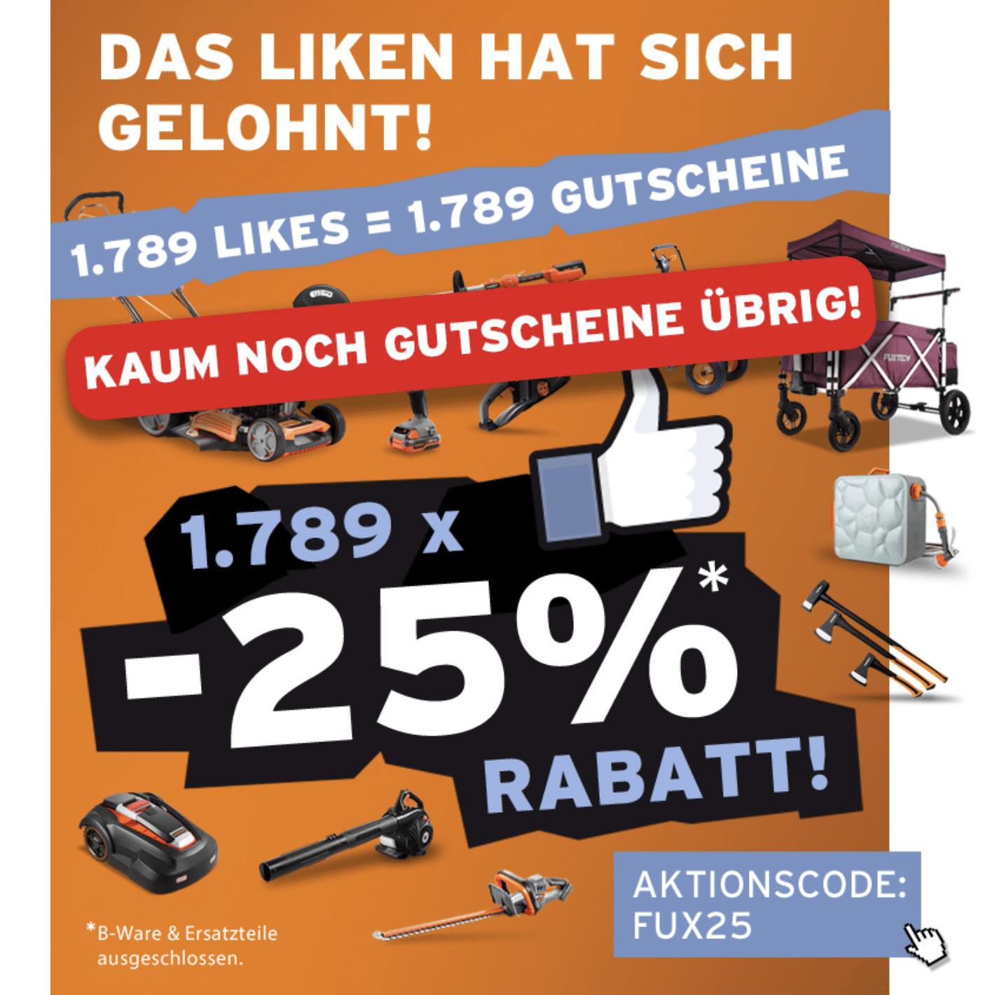 Bei Fuxtec gibt es gerade eine Aktion: Rund 1900 Likes wurden auf Facebook gesammelt – dafür haut der Shop ebensoviele 25 % Gutscheine raus, die ihr in dem Laden für Gartengeräte & co nutzen könnt. Aber ihr müsst schnell sein, wenn ihr einen Gutschein abgreifen wollt – denn 25 % auf ein Gartengerät ist schon ein stabiles Angebot. Die 25 % bekommt ihr mit dem Code FUX25.