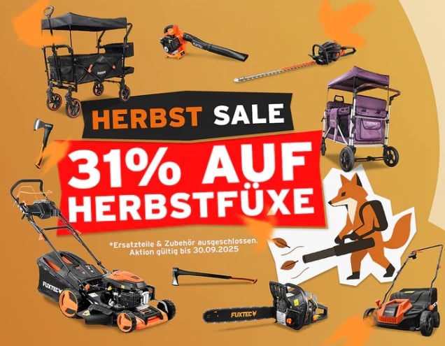 German Gartenpower – garantiert Fuxig! Beim Herbst-Aufräumen im Garten oder bei der nächsten Heimwerker-Action könnt ihr ordentlich werkeln: Fuxtec bietet aktuell mit dem unten stehenden Aktionscode 31% auf ausgewählte Artikel.
