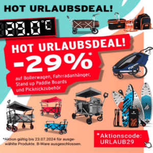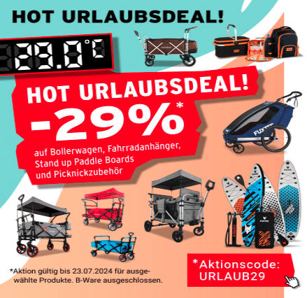 Fuxtec bietet aktuell einen attraktiven Rabatt von 29% auf Bollerwagen, Stand Up Paddle Boards, Fahrradanhänger und Picknickzubehör. Diese Aktion läuft bis zum 23.07.2024 und der Gutscheincode URLAUB29 wird automatisch an der Kasse angewandt – ihr müsst ihn nicht selbst eingeben.