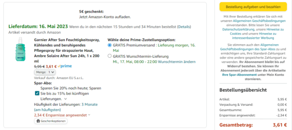 Deckt euch lieber jetzt schon ein, denn der Sonnenbrand kommt meistens so plötzlich wie das schöne Wetter. Um auf den Preis zu kommen, müsst ihr den 15% Rabattcoupon aktivieren und ein Sparabo einrichten. Sparabo’s können jederzeit wieder deaktiviert werden.