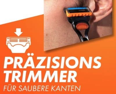 Bei gründlicher Pflege der Klingen nach jeder Rasur könnt ihr jede Klinge für bis zu 20 Rasuren nutzen – ihr kommt mit einer Klinge also mehr als einen halben Monat aus, wenn ihr euch nicht jeden Tag rasiert (z.B. nur unter der Woche) auch gut und gerne einen Monat. Praktisch ist zudem der Präzisionstrimmer auf der Rückseite der Klinge und der zusätzliche Klingenstabilisator hilft den Klingen, sich den Gesichtskonturen anzupassen.