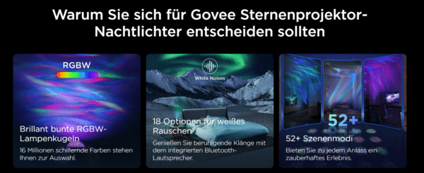 Screenshot 2024 09 16 142147Besonders hervorzuheben ist die innovative Dual-Lampenkugeltechnologie, die einen beeindruckenden Projektionsraum von bis zu 60 m² erschaffen kann. Wenn ihr auf der Suche seid, eure vier Wände mit Polarlichtern und Sternen zu beleuchten, könnte das genau das Richtige sein.