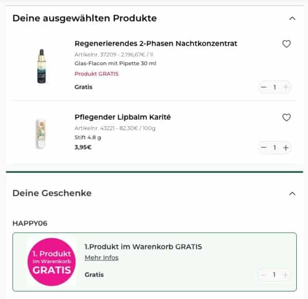 Schaut mal unten… So sieht der Warenkorb bei mir beispielsweise aus… (Das Produkt Regenerierendes 2-Phasen Nachtkonzentrat kostet eigentlich 65,90€, ist hier dann aber geschenkt):