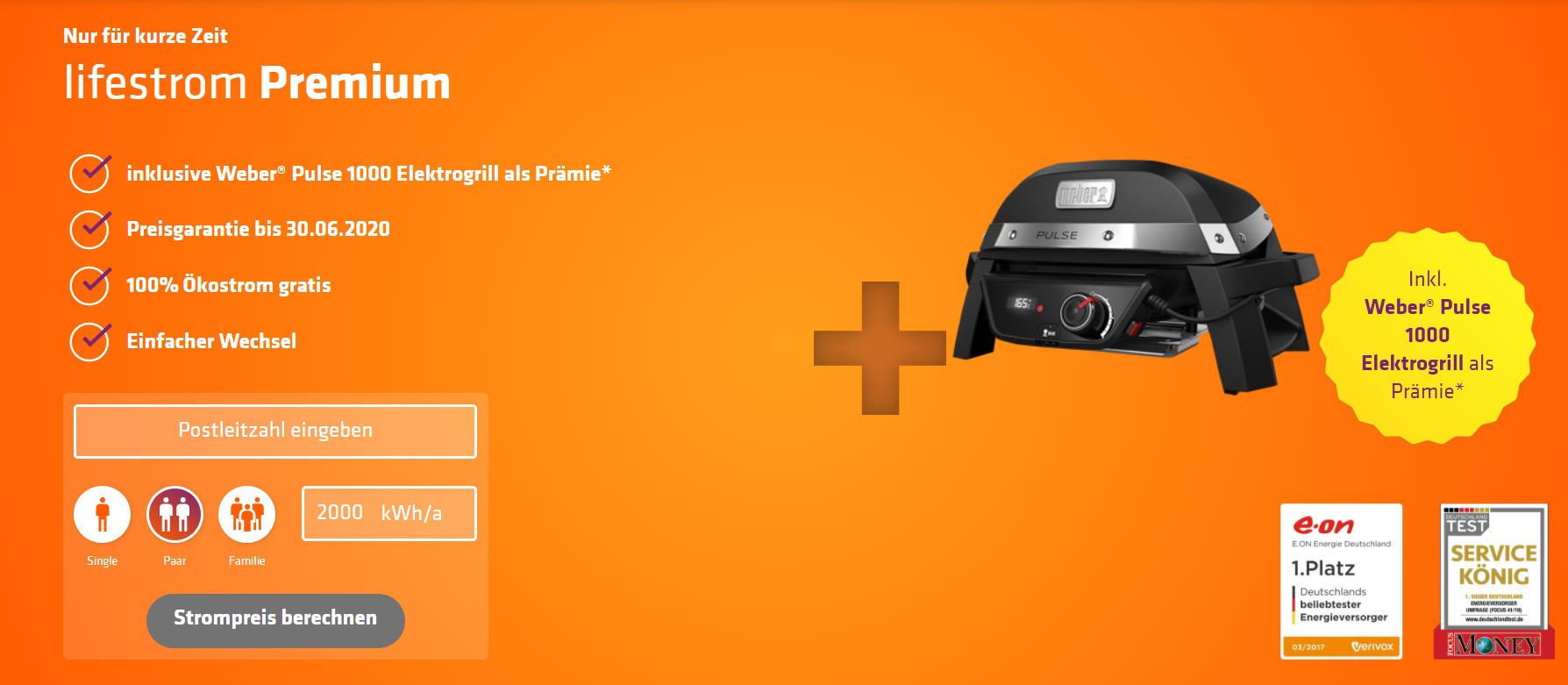 Wer aktuell oder in naher Zukunft seinen Stromanbieter wechseln kann, dem empfehle ich unbedingt einen Vergleich bei Toptarif inkl. einem 20€ Amazon-Gutschein als Prämie. Alternativ könnt ihr euch aber auch mal das Angebot von LifeStrom anschauen, das ist eine Kooperation von Sat.1 und e.On. Als Prämie zum Premium-Tarif gibt es hier den Weber Pulse 1000 Elektrogrill im Wert von 649€ dazu! Je nach Wohngebiet und Verbrauch kann sich das sehr lohnen: