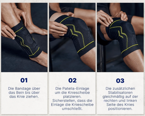 Sie wird über das Knie gezogen und richtig positioniert. Für den richtigen Sitz sorgen dabei die Patella-Einlage und die zusätzlichen Stabilisatoren. Solltet ihr zwischen zwei Größen liegen, ist der Griff zur kleineren Größe sinnvoll.