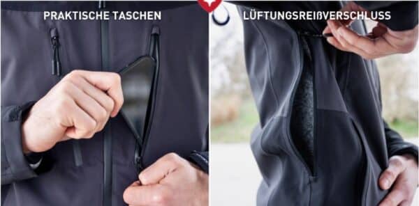 Für zusätzliche Belüftung, gerade wenn es etwas wärmer wird oder ihr euch mehr bewegt, sind unter den Armen Reißverschlüsse integriert (Bild unten rechts).