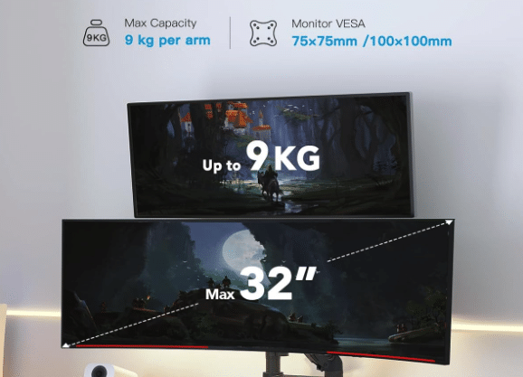 Gefertigt aus einer robusten Aluminiumlegierung, hält sie problemlos Bildschirme von 13 bis 32 Zoll und bis zu 9 kg pro Monitor. Das passt zu vielen gängigen Modellen, vorausgesetzt, diese unterstützen die VESA-Normen 75 x 75 mm oder 100 x 100 mm – etwas, das ihr vor dem Kauf checken solltet.