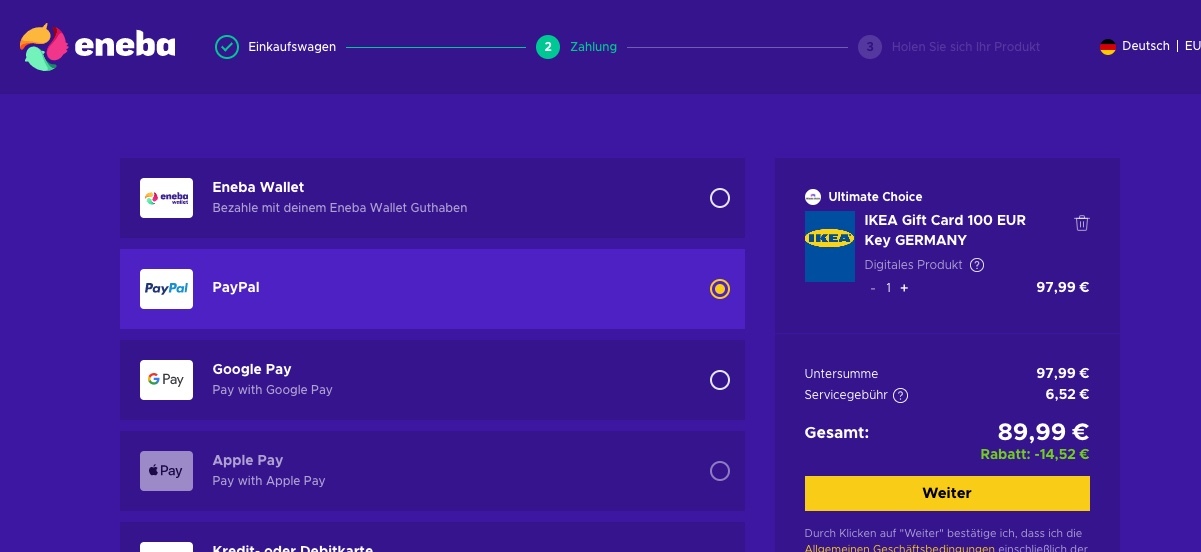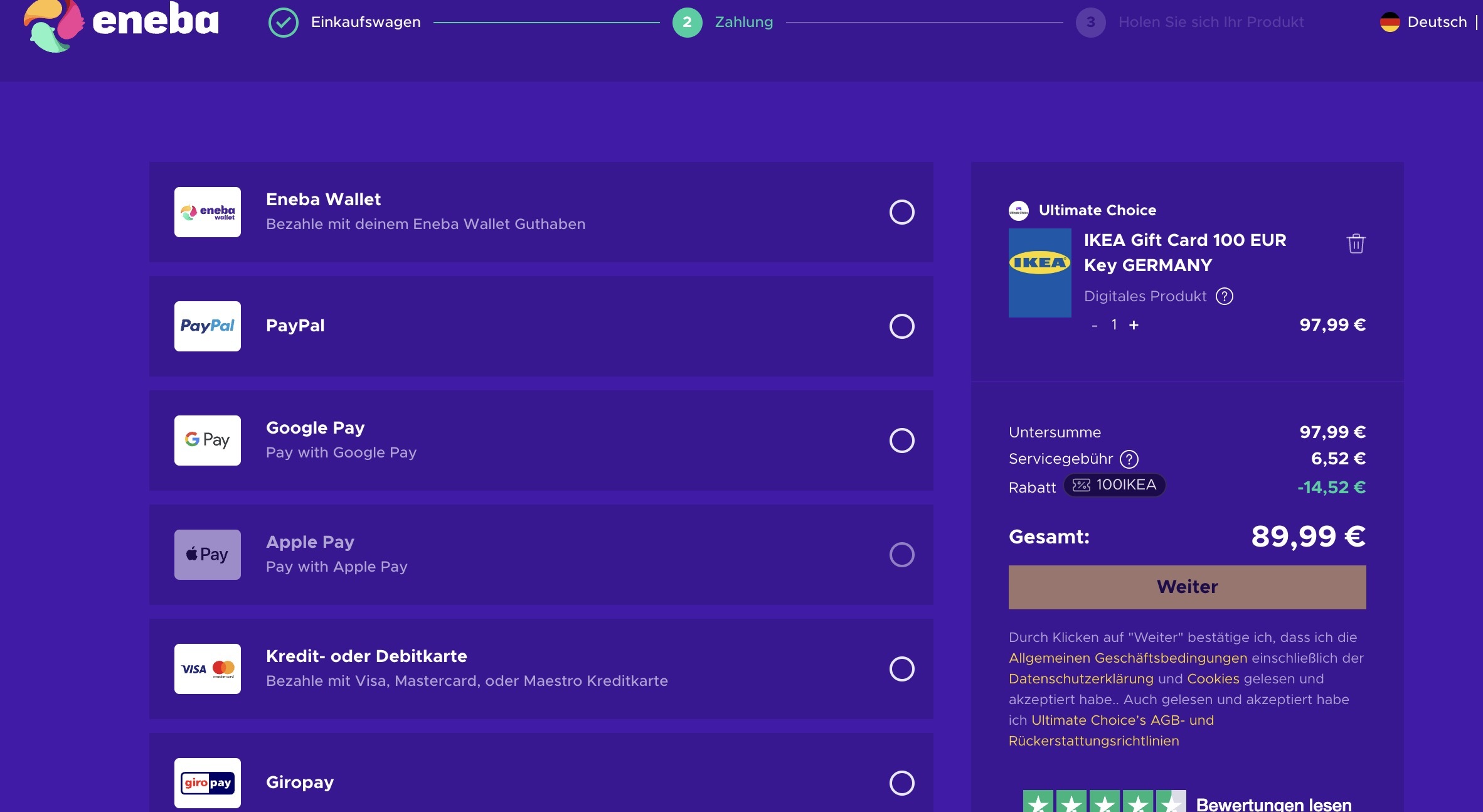 vastic 29.02.2024, 22:07Ich habe bei der letzten Aktion mrhrere Gutscheine gekauft a 100 Eur. Wollte mir einen Kleiderschrank kaufen. bei Ikea vor Ort haben sie nicht funktioniert. online Guthaben Überprüfung hat ergeben dass 0 Eur drauf sind. eneba sagt die Gutscheine wären ok und ich soll mich an Ikea wenden. Ikea sagt dass kein Guthaben drauf ist. VORSICHT… hoffe das topdeal Team kann helfen?
