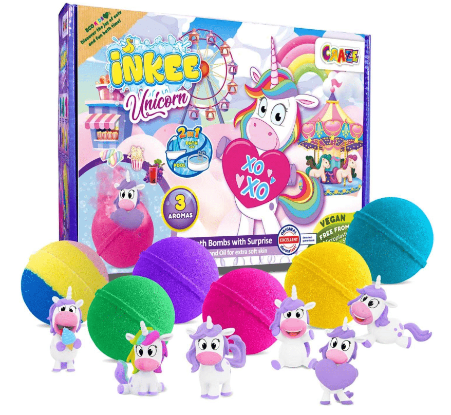 Bei den INKEE Surprise Badebomben erwartet eure Kids mehr als nur ein normales Bad. Diese sind extra für Kinder entwickelt und bringen nicht nur farbenfrohen Schaum ins Wasser, sondern auch ein spannendes Erlebnis für kleine Einhorn-Freunde. Mit jeder sich auflösenden Kugel taucht ein neues Einhorn-Spielzeug auf, das die Sammelleidenschaft weckt. Für die Eltern unter euch ist es wichtig zu wissen, dass die Badebomben zum einen natürlich hautfreundlich und dermatologisch getestet, aber zum anderen auch keine Flecken auf Haut, Haaren oder Badewanne hinterlassen.