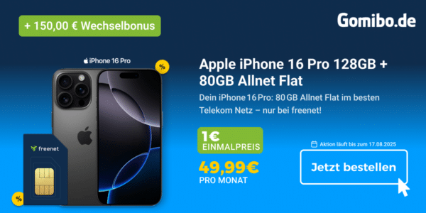 Gomibo hat derzeit das Apple iPhone 16 Pro mit 128GB für einmalig nur 1€ am Start. Dazu gibt es eine 80GB Telekom 5G Allnet-Flat für 49,99€ monatlich + 150€ Wechselbonus! Ein echt starkes Angebot für alle, die nach dem iPhone suchen. Wer mehr Speicher sucht, kann sich die 256GB Variante für 99€ sichern (eff. 1,03€ mtl.).