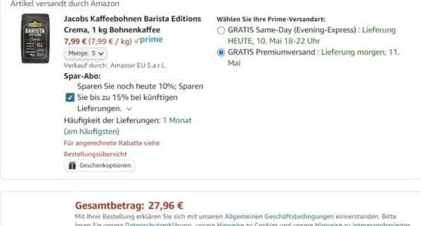 Lust auf Kaffee? Bei Amazon bekommt ihr gerade 1 kg Kaffeebohnen von Jacobs (Barista Editions) für nur 8,99€. Versandkostenfrei wie immer mit Prime oder ab 29€ Bestellwert. (Der Vergleichspreis von 9,99€ kommt von Rewe – wäre dann aber ohne Lieferung.)