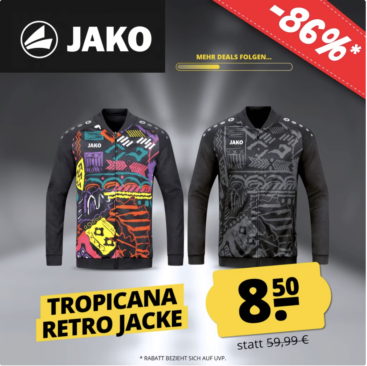 Diie Jako Tropicana Retro Herren Jacke kommt im chilligen Retro-Look. Leicht, farbenfroh und mit einem Hauch von Vintage-Flair, könnt ihr mit dieser Jacke eure Garderobe aufpeppen. Bei SportSpar bekommt ihr sie jetzt für 13,45€ inkl. Versand.