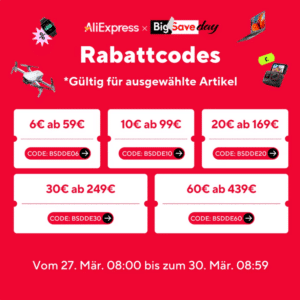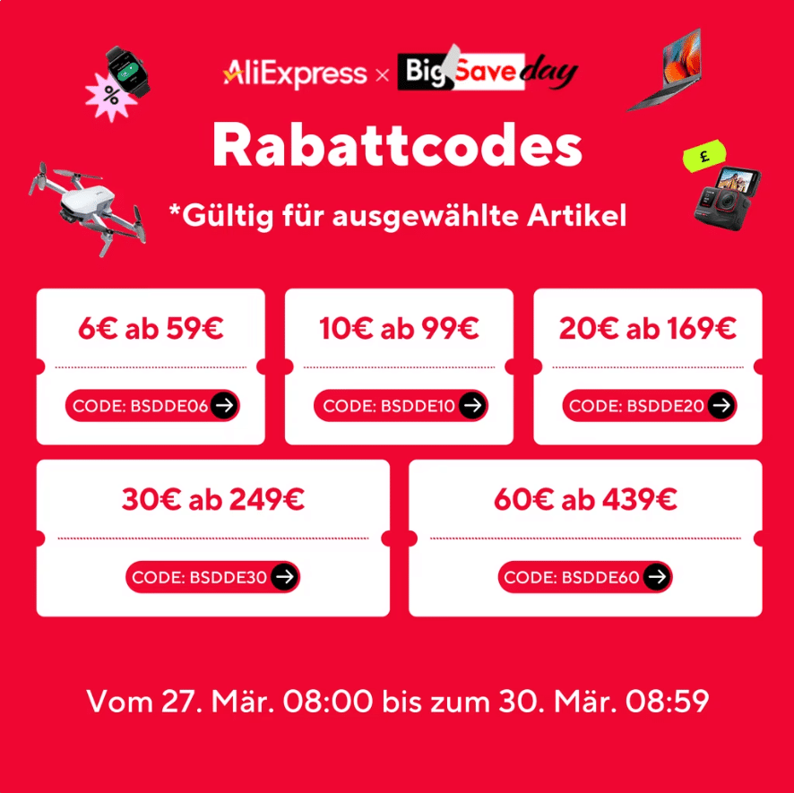 Mit den unten stehenden exklusiven Gutscheinen könnt ihr noch mehr sparen! Bei AliExpress gibt es bereits jetzt einige attraktive Angebote, insbesondere bei den Smartphones, für die die Gutscheine jedoch eh nicht gültig sind.