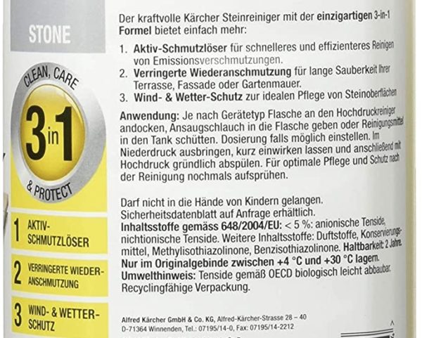 „Kraftvoller Stein- und Fassadenreiniger mit der einzigartigen 3-in-1-Formel für höchste Reinigungsleistung. Mit Aktiv-Schmutzlöser, Schutzformel gegen Wiederanschmutzung sowie Wind- und Wetterschutz. Für höchste Reinigungseffizienz, Pflege und Schutz in einem Schritt. Einsetzbar auf Steinterrassen, Mauern und Fassaden rund um Haus und Garten.“