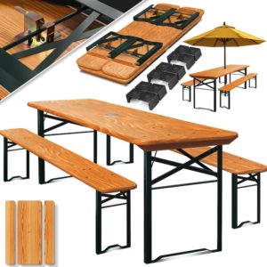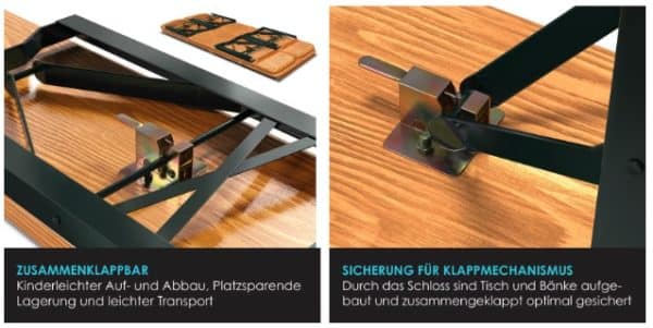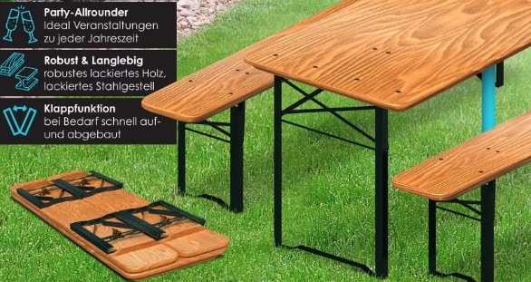 Das Bierbank-Set besteht wie gesagt aus Kiefer- und Fichtenholz und ist mit einem klaren Holzlack lasiert, um vor eindringender Feuchtigkeit zu schützen. Das robuste Stahlgestell und die stabilen Scharniere sorgen für eine gute Standfestigkeit und machen die Garnitur langlebig. Die Oberseiten und Kanten des Holzes sind ebenfalls lackiert und sorgen für eine ansprechende Optik.